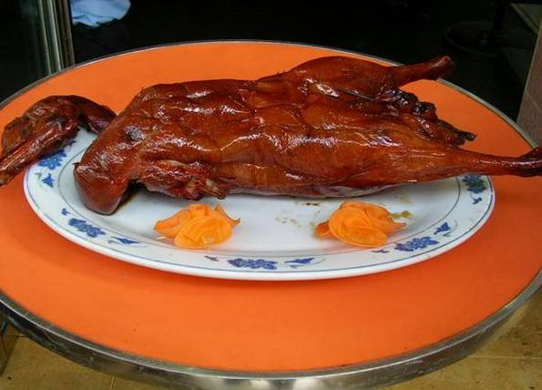 广式烧鹅已有600年的历史,足可以与北京烤鸭媲美,是广东传统名菜。以整只原料烘烤而成。成品特点是:色泽金红光亮、肉体饱满,腹含卤汁,油脂盈润。切成小块后,皮、骨、肉连而不脱,入口即离。皮脆酥香,肉滑鲜美,骨软香浓。烧鸭的制作非常讲究,烘烤时:以优质木炭为燃料,待其燃到烟尽,适时翻转鸭身,烧出的鸭皮黄脆不焦,肉酥松软、甜嫩离骨,非常可口。若配烧鸭料或酸梅酱食用,更是别具风味。 我们的烧鸭结合传统的烤制方法,采用特有的俺制配料技术,形成了适合广大人民群众的独特风味,鸭体光亮油润、枣红鲜艳,皮层酥脆.