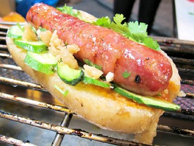 大肠包小肠:糯米肠包香肠又叫做“大肠包小肠”,在台湾已有三十年的历史,因其美味又独具特色已经成为台湾十大知名小吃之一。大肠包小肠说也简单,就是将体积较大的糯米肠切开后,再夹住体积较小的台式香肠,即成为"大肠包小肠",与美国的热狗有异曲同工之妙。